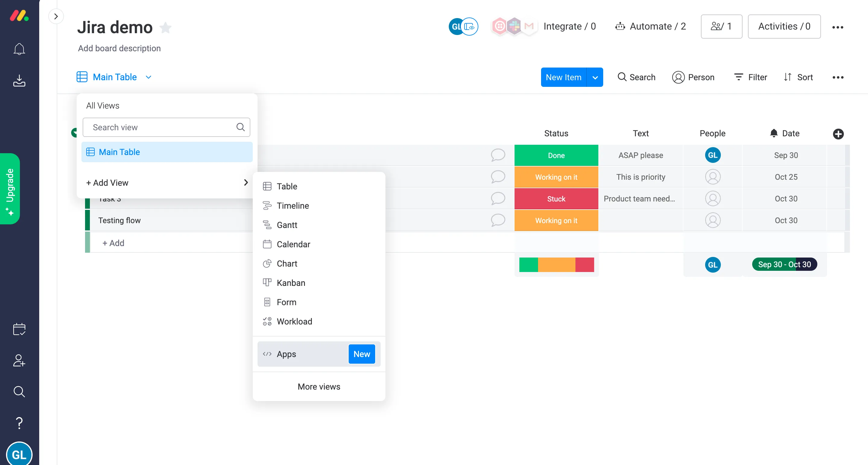 Section titled “How to add Unito as a view in your monday.com projects”Once you’ve installed Unito, adding it to your projects is super easy. Just go to the top-left of your project and click the view dropdown under your project’s name. The exact wording of the dropdown will depend on what view your project is using. In this example, it’s Main Table.