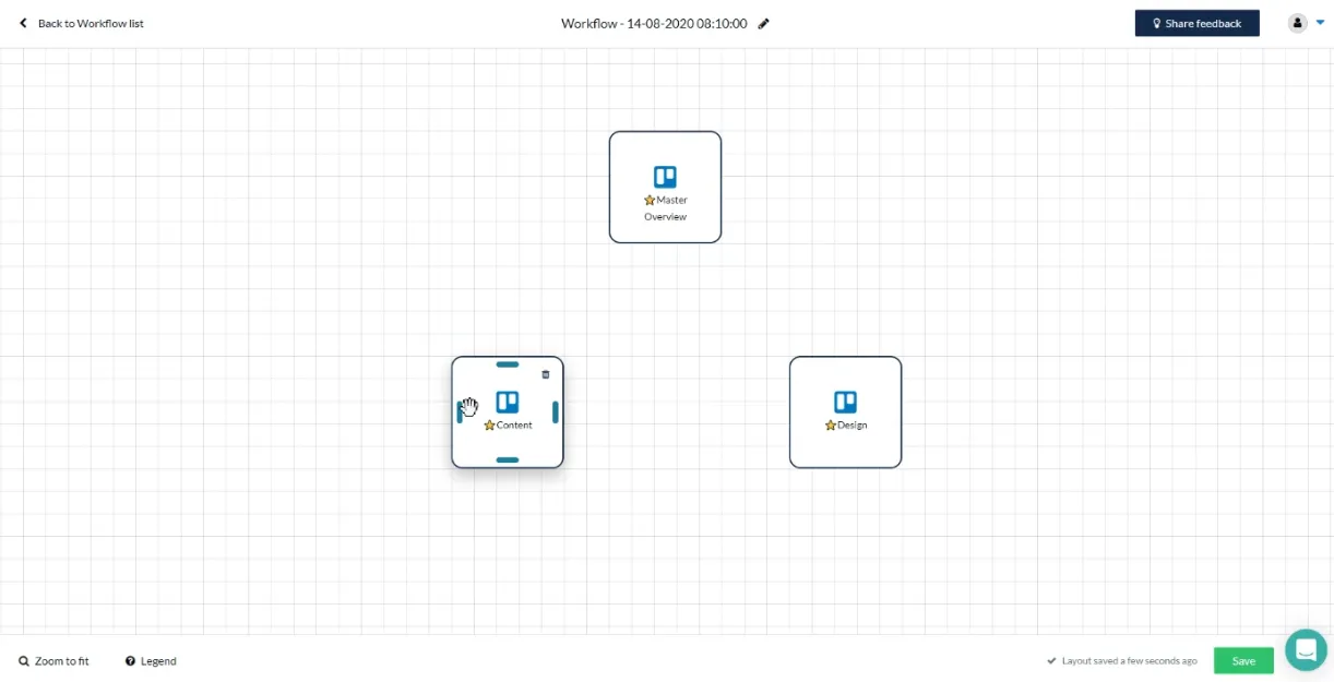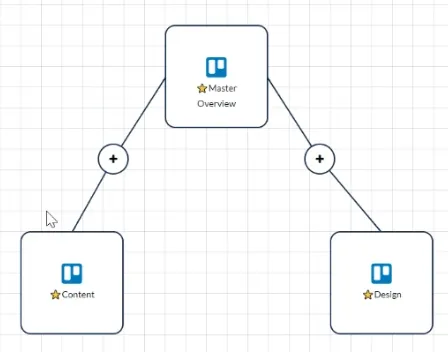With this workflow, cards from the Design and Content boards will be synced with the Master Overview board, and vice versa.