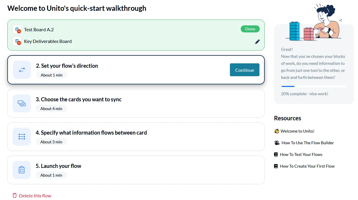 The quick-start walkthrough allows you to create rules for filtering and automating the flow of information. You can also customize your mappings, see a history of the last 100 changes in your flow, and more. But to get your flow up and running with default settings, all you need to do is make sure Auto-sync is toggled, and click on Save and sync.
