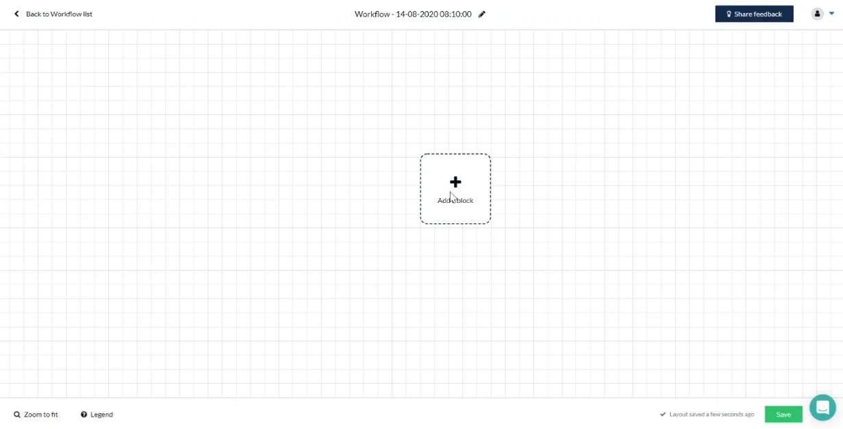 This grid is where you’ll be building your workflows and customizing your rules. Notice that an Add a block prompt hovers wherever your mouse hovers. Click anywhere in the grid to add the first block to your workflow.