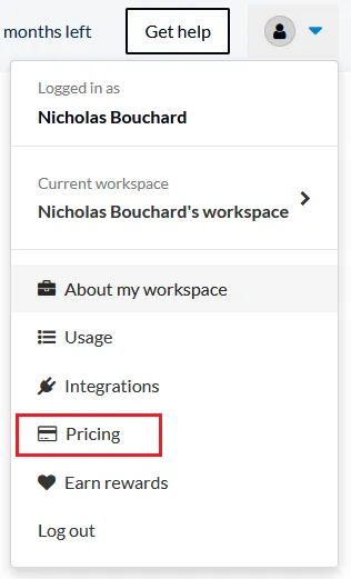 Section titled “How to choose your plan during a free trial”At any point during your trial, you can select which plan you want to sign up for by opening the More options menu in the top right corner of your screen and clicking on Pricing.