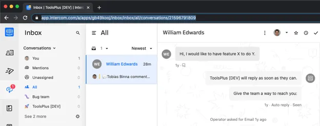 It should look something like this: https://app.intercom.io/a/apps/mqhge34o/inbox/inbox/468954/conversations/13271347953
