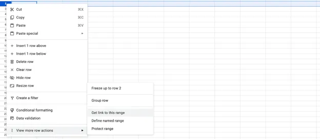 Section titled “Google Sheets”Right-click on one of the rows, go to “View more row actions” and then “Get link to this range”: