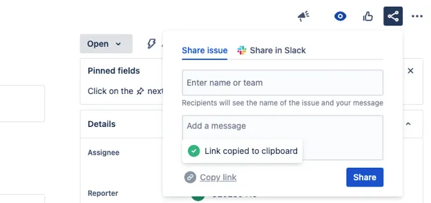 Section titled “Jira Cloud and Data Center”You can use the share functionality to get the link to the issue: