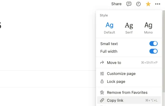 Section titled “Notion”In your Notion database, if you select one item, and then click the three dots in the top-right corner, you should see the option to “Copy link”: