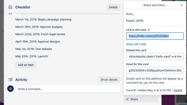 Section titled “Trello”If you open a card, you should see the “Share” option in the bottom right. You can click this and find the “Link to this card”: