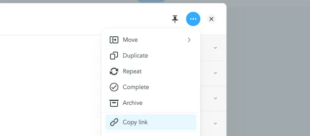 Section titled “MeisterTask”If you click in the top-right corner of a task, you should see the option to “Copy link” in the dropdown: