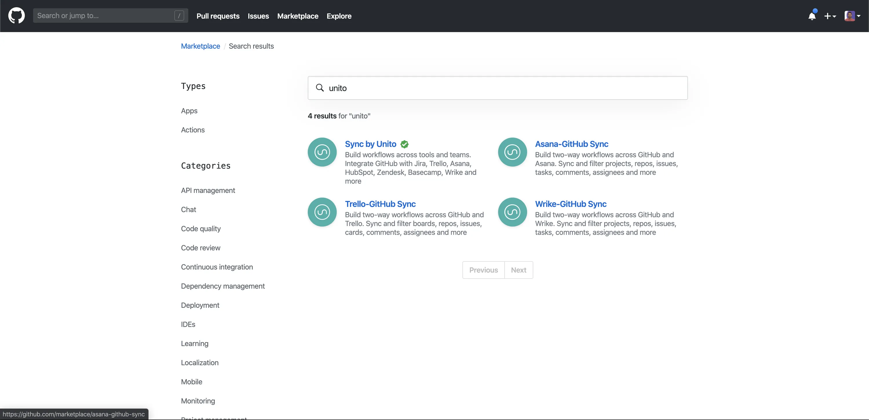 Section titled “Find Unito in the GitHub Marketplace”- Follow this link to Unito’s listing in the GitHub marketplace.