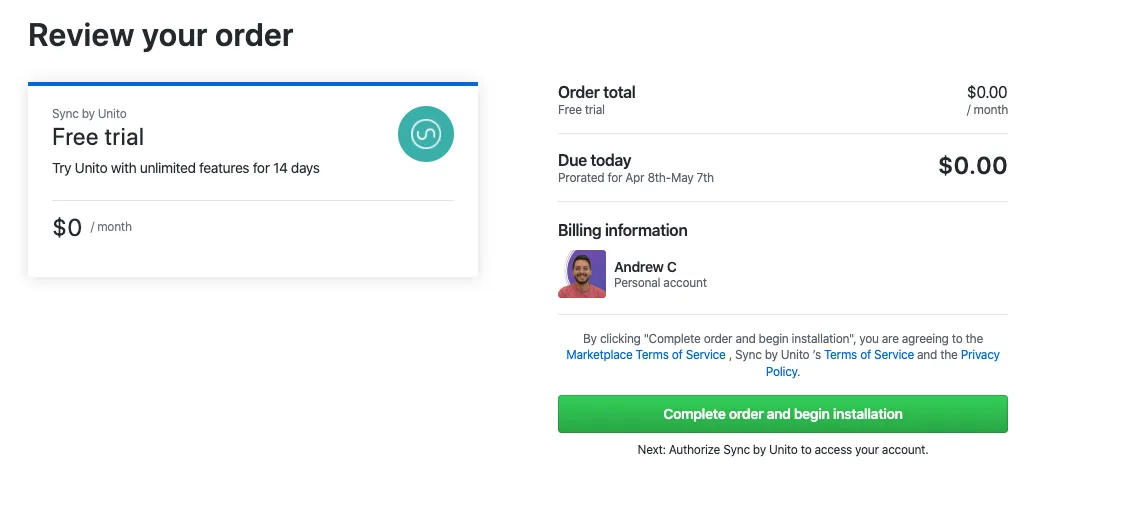 Follow the prompts to create your Unito account (including your name and address for billing purposes; no credit card required for the free trial).