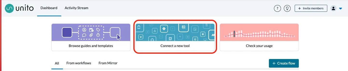 Section titled “Connecting from the Unito dashboard”From the Unito dashboard, simply select C**onnect a new tool** and find your tool in the list on the next page.