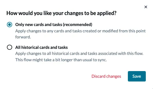 Section titled “Syncing all historical work items”Sometimes, the default setting might not be right for your use case. In these situations, you can apply flow changes to all historical data so that updates are processed throughout your workspace.