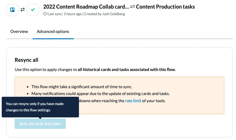 Below Resync all, click the Sync all button. If you haven’t made any changes to your flow, it will be greyed out (pictured below).