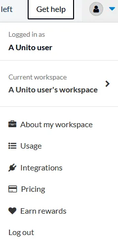 Section titled “How to change the credit card on file”Need to change the credit card you use with Unito? Easy. Start by opening the menu in the top-right corner of your dashboard, then click on Usage & billing.